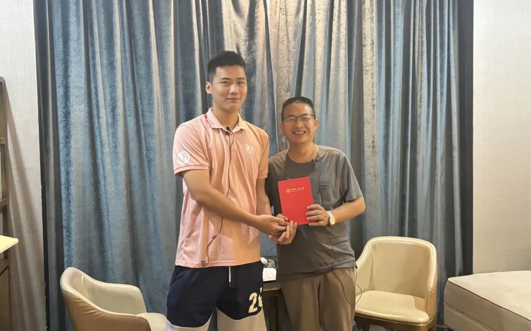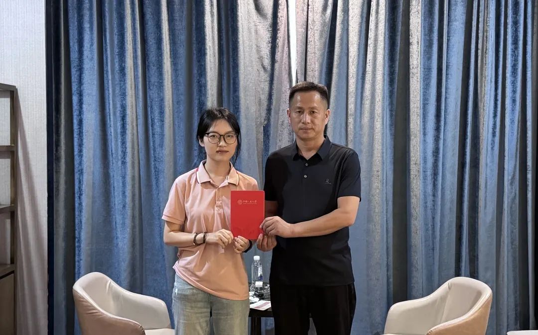 ▲经济与贸易学院硕士生赵怿玮对锦滨镇党委书记张军访谈后赠书留念