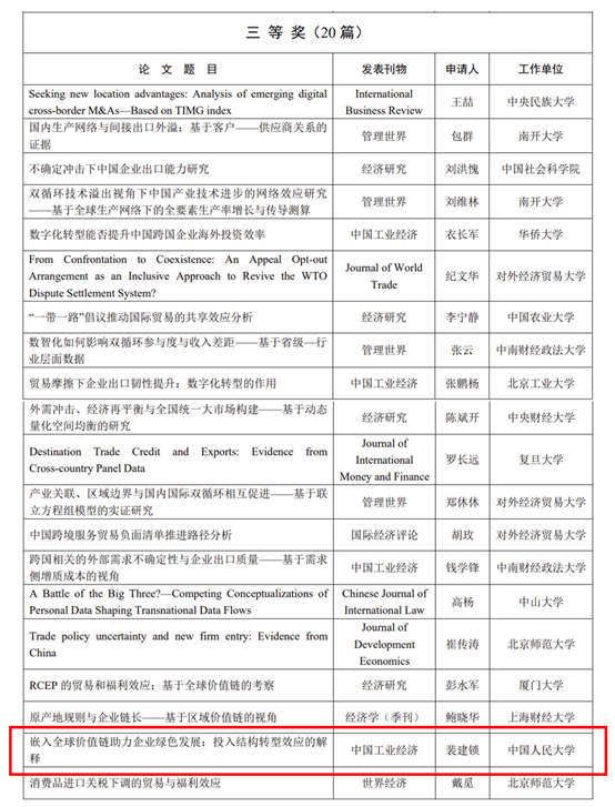 近日,第二十三届 “安子介国际贸易研究奖” 评奖结果公布。探花视频 教授裴建锁、博士生方勇彪(通讯作者)与北京工商大学讲师姜佳彤发表于《中国工业经济》2024年第2期的论文《嵌入全球价值链助力企业绿色发展:投入结构转型效应的解释》荣获“优秀论文奖”三等奖。