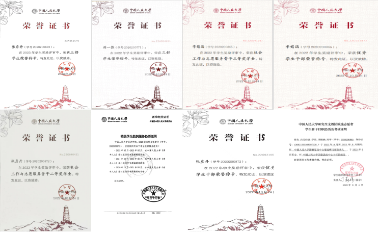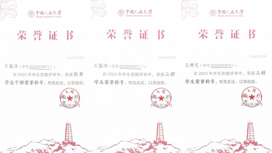 宿舍的两位成员,深入参与学校-学院-班级各级各项学生工作当中,切实发挥了骨干示范表率作用。宿舍长王錾沣担任校研究生会宣传部负责人、学院研究生会主席团成员,兰梓艺任学院2022级博士三班班长。在学校、学院、班级大大小小各类文体活动、志愿服务中,总能看到他们服务同学的身影。在2022-2023年度评奖评优中,宿舍成员均获评中国人民大学三好学生,王錾沣获评中国人民大学优秀学生干部。