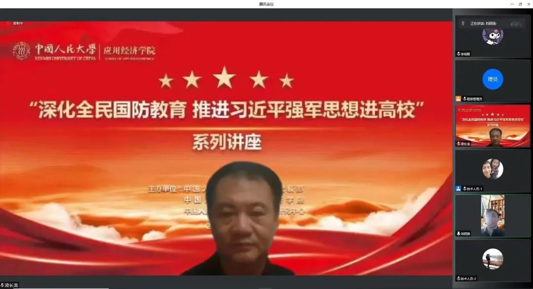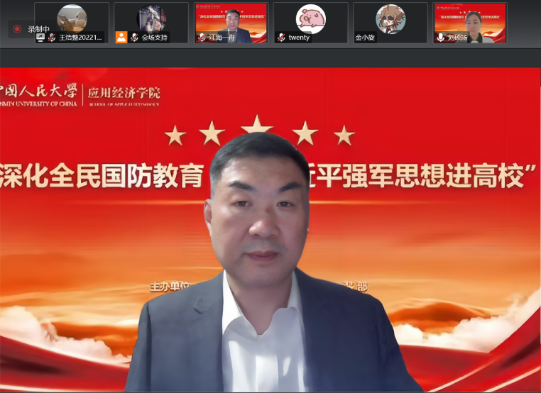 北京市教委体卫艺处国防教育负责人、二级调研员凌长龙带来“当代大学生要做落实深化全民国防教育的排头兵”主题讲座。凌长龙立足首都高校国防教育现状,介绍了首都教育系统国防教育的特点,号召人大师生提高思想站位、强化使命担当、发挥人大优势,传承军政结合的优良传统,营造良好的国防教育氛围,通过学习习近平强军思想,使关心国防、热爱国防、建设国防、保卫国防成为当代大学生的思想共识和自觉行动,引导学生从国防教育的被动参与者转变为主动作为者,为国防和军队建设储备更多高素质后备力量。