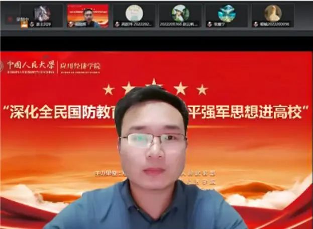 中国人民大学新闻学博士研究生、“全国模范退役军人”周晓辉带来了“青年学生国防意识培养”主题讲座。周晓辉认为,青年国防意识的培养应从“对军队历史之了解、对国家英雄之尊崇、对青年责任之勇敢”三个方面做起。他从近期的第十四届中国珠海航展和人民空军成立73周年讲起,从军史和我军装备发展的角度讲述了人民军队苦难辉煌的前进历程,通过鲜活的故事激发同学们的国防意识和爱国情怀。作为朋辈榜样,他还以多名人大学子和自己参军的故事鼓励更多人大学子携笔从戎,以实际行动争当先锋闯将。