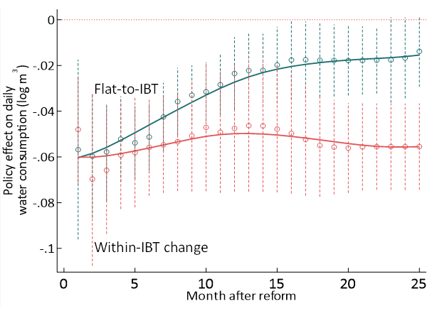 注:纵轴表示水价改革对家庭日度用水量对数值的影响估计,横轴表示回归中依次纳入改革后1个月、2个月、3个月……直至全样本期的估计。Flat-to-IBT和Within-IBT change分别表示从统一费率制转为阶梯水价、在既有阶梯结构内上调价格(下同)。图中圆点表示点估计,竖线表示95%置信区间。