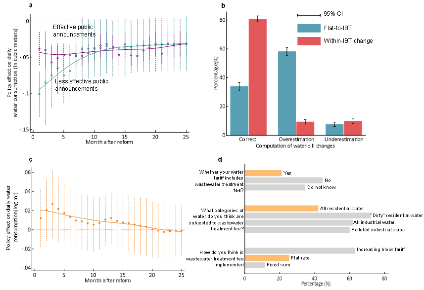 注:a为政策公告文本有效性异质性分析结果;b为不同水价改革的水费影响网络问卷调查结果;c为污水处理费上涨改革的影响估计结果;d为污水处理费认知调查结果,其中橙色条形表示正确选项。