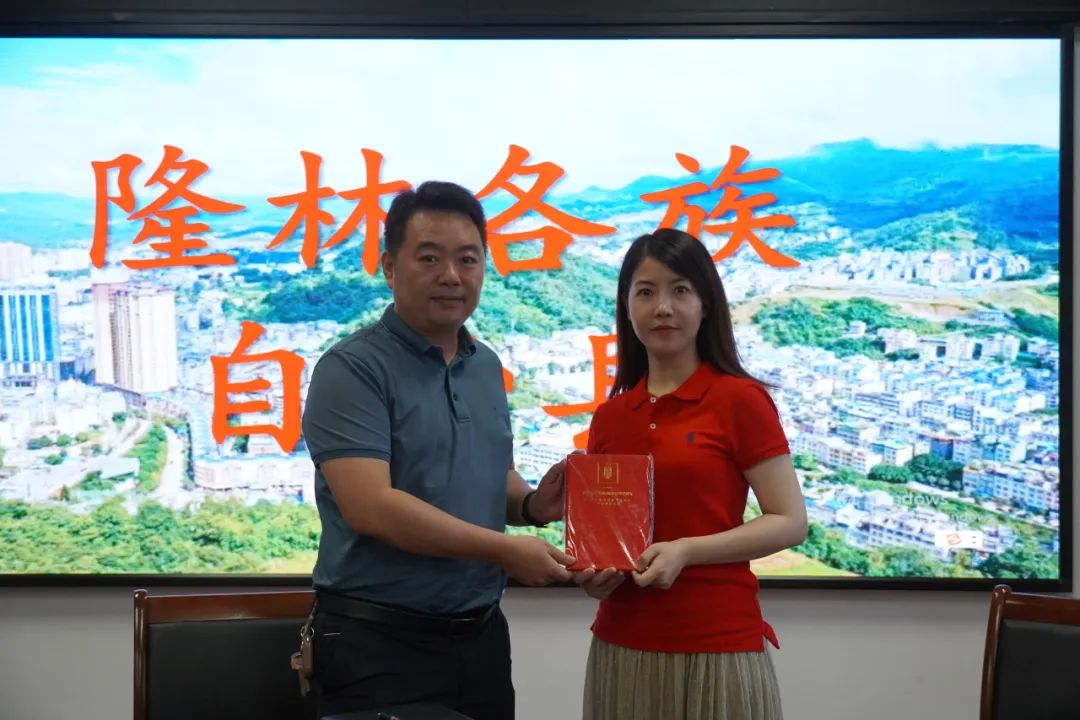 ▲梅应丹向隆林各族自治县政协党组副书记、副主席李锋赠送纪念品