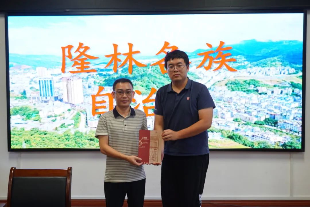 ▲崔征洋向隆林各族自治县国有资产管理中心副主任谢正辉赠送纪念品
