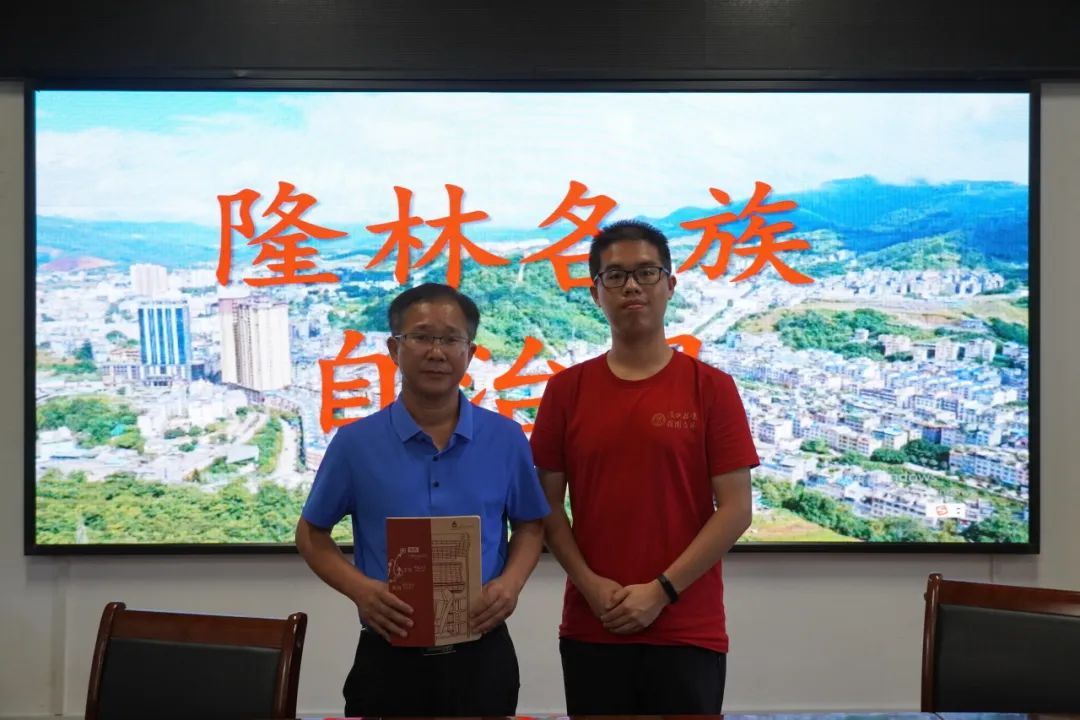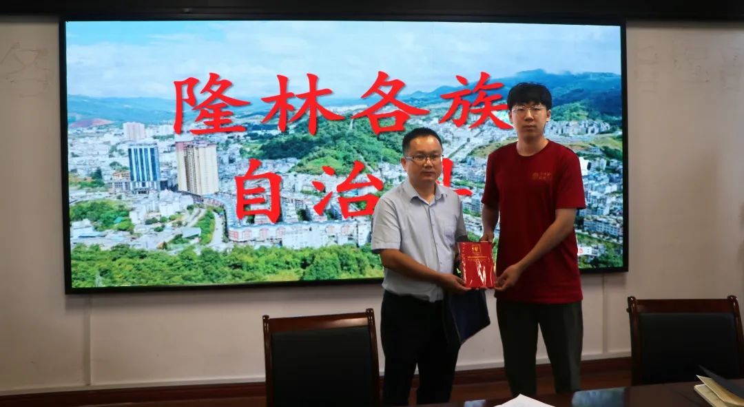 ▲郝浩宇向隆林各族自治县水利局党组书记、局长刘杰赠送纪念品