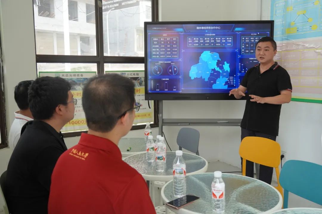 在调研过程中,恰有一名搬迁群众来找工作,调研团观摩了公司员工接待的全过程。从询问群众的技能、证书情况,到调出匹配岗位供群众选择,再到确定岗位办理手续,全程都十分方便快捷。除线下服务外,粤桂合作公司还通过与各村村集体合办的“就业驿站”群聊,提供线上就业信息推送与线上咨询服务。截至目前,粤桂合作公司已在线上线下累计完成就业服务55000余人次,帮助许多搬迁群众能够自食其力地实现稳定脱贫致富。