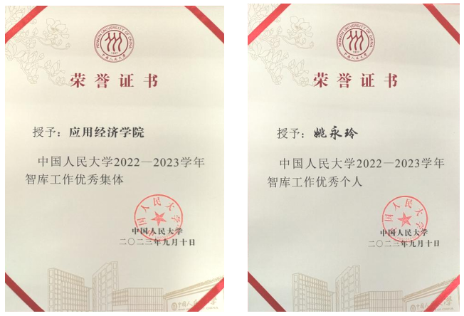 学院服务国家重大战略需求,智库成果显著。学院获“中国人民大学2022-2023学年智库工作优秀集体”,姚永玲教授获“中国人民大学2022-2023学年智库工作优秀个人”。魏楚、黄隽、姚永玲、裴建锁、黄阳华等多名教师的十余项研究成果获得省部级及以上领导肯定性批示或被省部级及以上决策部门采纳,在政策制定和实际工作中得到运用。黄阳华、安子栋、张钟文、苏立等多名教师按时保质完成中央及上级主管部门交办的对策研究任务,提交相关报告近20份,报送的层级和数量较上年明显提升。
