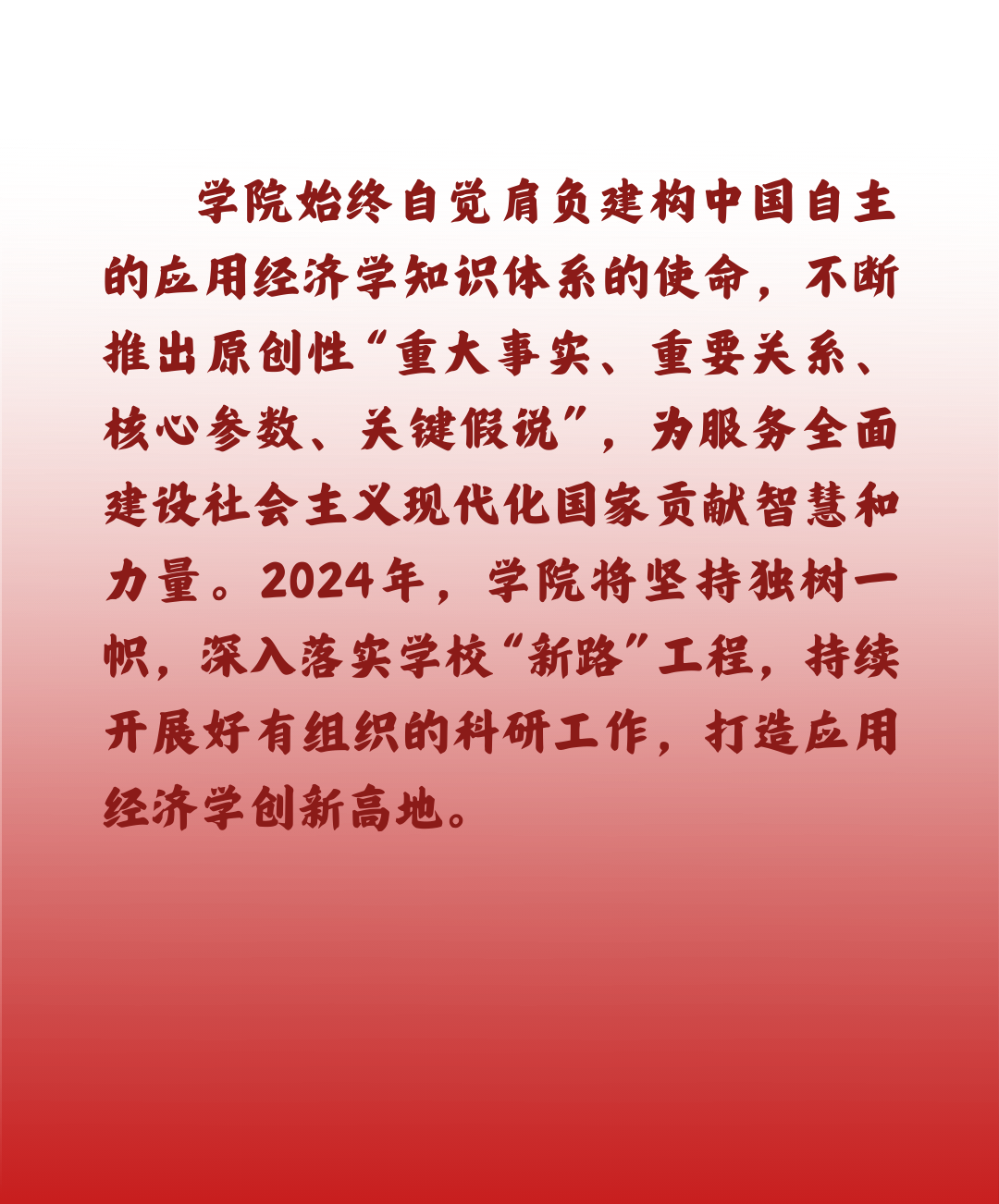 学院支撑学校首届环湖经济圈发展论坛,多位教师参与编写的《环太湖经济圈协同创新发展研究报告》在论坛发布;联合西南财经大学主办第四届中国应用经济学年会(2023),围绕应用经济学科如何服务建构中国自主的知识体系、服务国家重大战略需求、服务高质量发展等重要问题开展研讨交流;与兄弟学院合办中国人民大学社会科学高等研究院(深圳)数字经济研究中心成立大会暨“高质量发展与中国式现代化”主题论坛,跟踪、研究数字经济实践、数字经济治理、数字经济产业政策、国家及区域间数字经济发展与规制协同等,服务粤港澳大湾区经济发展;召开《数字产业发展报告(2023)——装备制造业的数字化转型与区域分布》报告发布会,立足于中国实际,解决中国问题,为推进装备制造业数字化转型与区域分布格局的优化提供更多有价值的研究和建议;召开“建构中国自主的应用经济学知识体系”系列讲座15场,“和平与发展研究院系列讲座”9场,“能源与碳经济研讨会”12场,“贸易与发展研讨会”“区域与城市经济研讨会”等近10场,受益师生超千人次。
