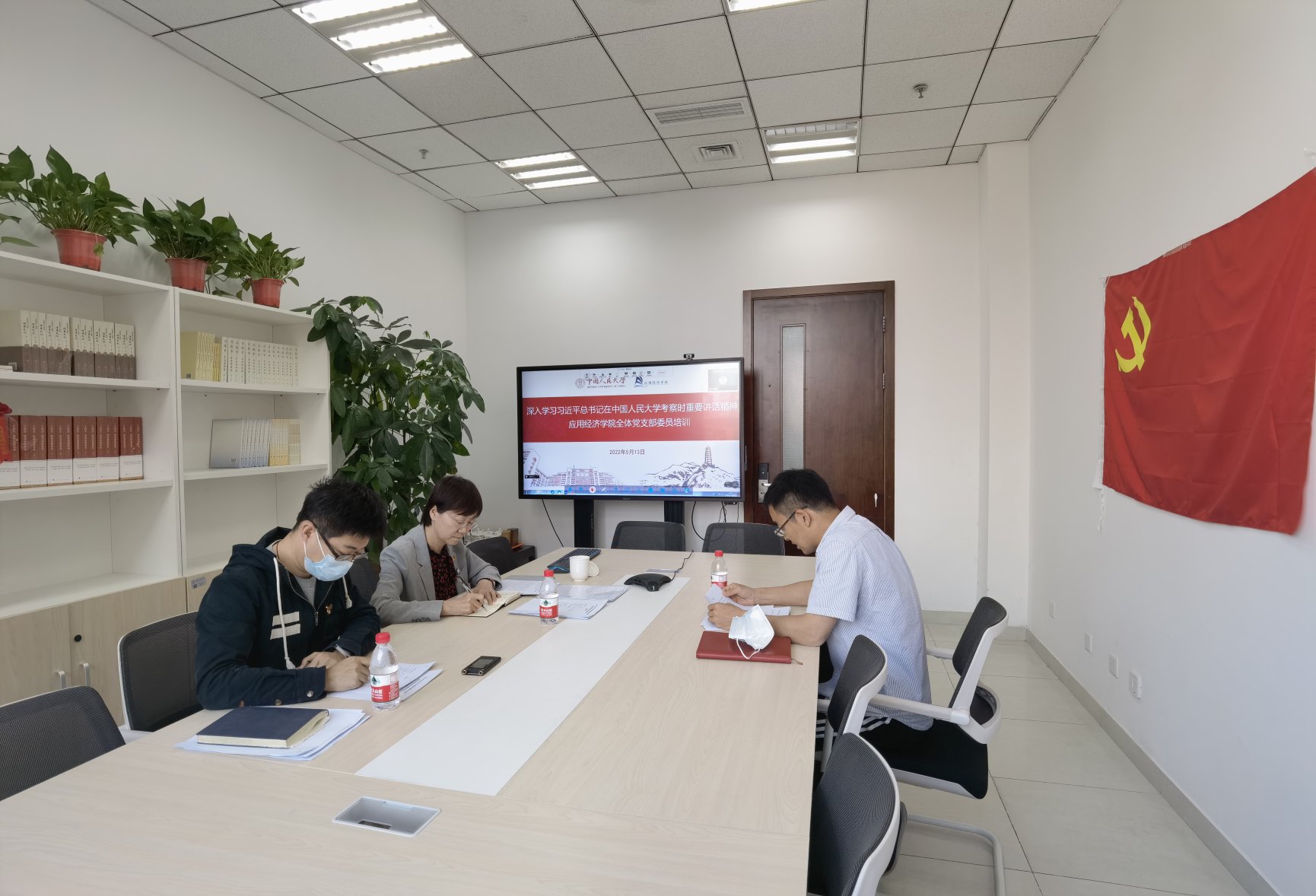 首先,宋东霞带领大家一起学习了习近平总书记在中国人民大学考察时的重要讲话精神,并传达了教育系统学习贯彻习近平总书记在考察中国人民大学时重要讲话精神座谈会、中国人民大学全校干部师生大会、2022年党支部书记培训开班等会议上,张东刚书记和刘伟校长的重要讲话精神。宋东霞强调,习近平总书记亲临中国人民大学考察并发表重要讲话,充分体现了以习近平同志为核心的党中央对中国人民大学的关怀厚爱、对广大师生的殷切期望。张东刚书记和刘伟校长的讲话,对全校深入学习领会、贯彻落实习近平总书记重要讲话精神提出了明确要求。学院要按照学校的统一要求和部署,把学习宣传贯彻落实习近平总书记在学校考察时的重要讲话精神作为当前和今后一个时期的首要政治任务,学深悟透、落地生效。