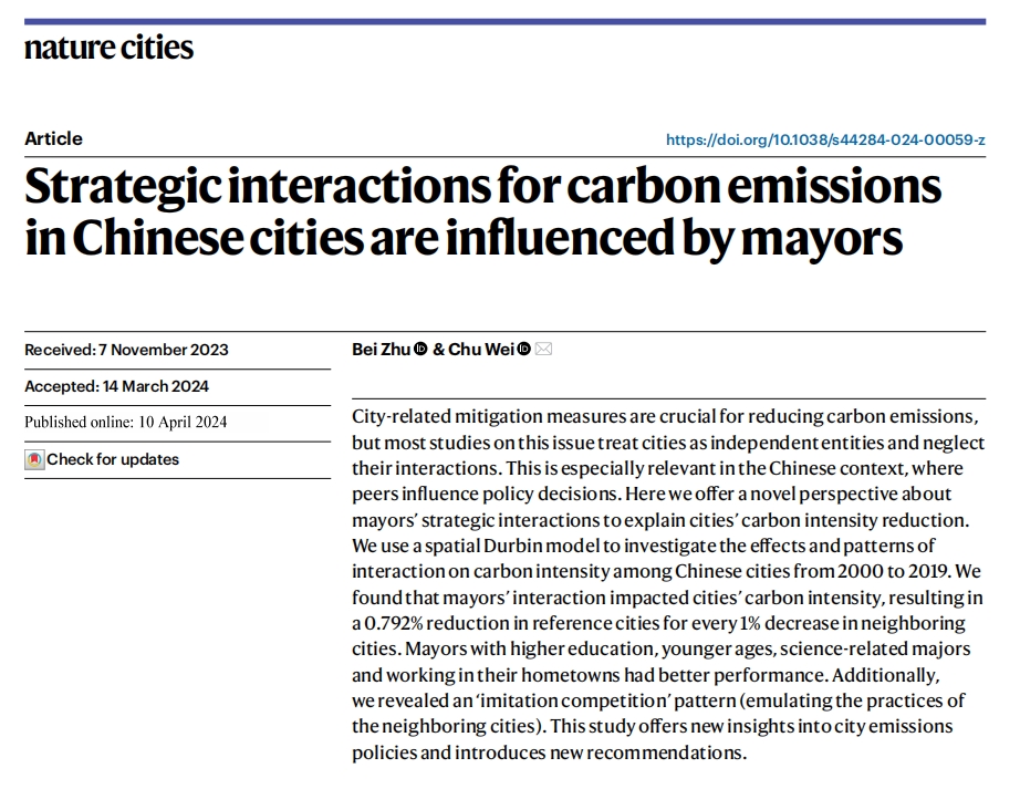 4月10日,魏楚教授团队的研究成果“Strategic interactions for carbon emissions in Chinese cities are influenced by mayors”以研究论文(Article)形式在国际学术期刊《自然·城市》杂志(Nature Cities)上发表(//doi.org/10.1038/s44284-024-00059-z)。探花视频 博士研究生朱蓓是论文的第一作者,魏楚教授是通讯作者。