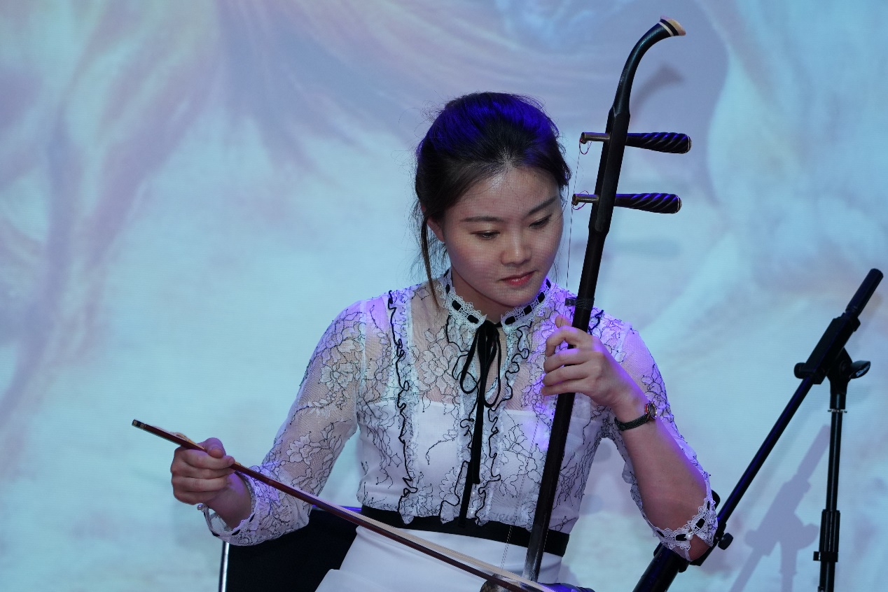 杜甫诗云:“昔有佳人公孙氏,一舞剑器动四方。”撒莉老师再度登台,表演中国古典舞——剑舞《飞雪玉花》、《龙鼓·篆音》,一开场便惊艳全场。由箫、鼓乐与古筝带来的音乐上的力量感和空气感,与剑舞那刚柔并济、行云流水、酣畅淋漓、荡气回肠的动作,将柔美与帅气完美结合,让在场观众感受到中国古典舞中蕴含着深厚的文化精髓,将晚会推向高潮。