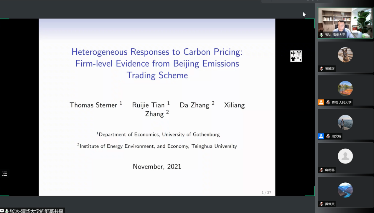 清华大学能源环境经济研究所副教授张达以Heterogeneous Responses to Carbon Pricing: Firm-level Evidence from Beijing Emissions Trading Scheme为主题进行展示。以北京碳排放交易试点为例,测度了不同部门、不同规模的企业在纳入碳排放交易市场后,对排放情况和碳配额所产生的影响。