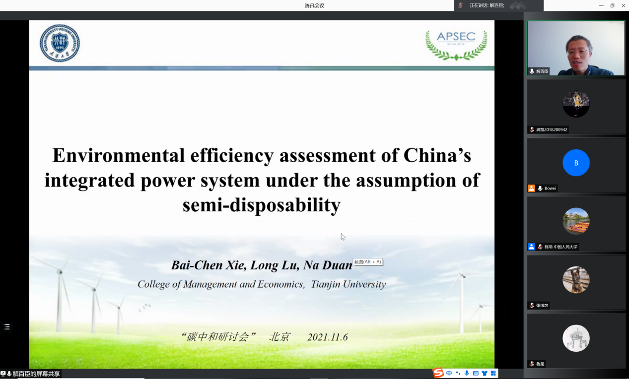 天津大学管理与经济学部教授解百臣以Environmental efficiency assessment of China’s integrated power system under the assumption of semi-disposability为主题进行展示。他的研究使用了半参数模型,评估了市场化交易对中国电力部门的环境效率影响,结果显示市场化交易在不同地区的环境效率影响有所不同,发电部门及输电部门的环境效率影响很大,配电部门的环境效率影响较小。