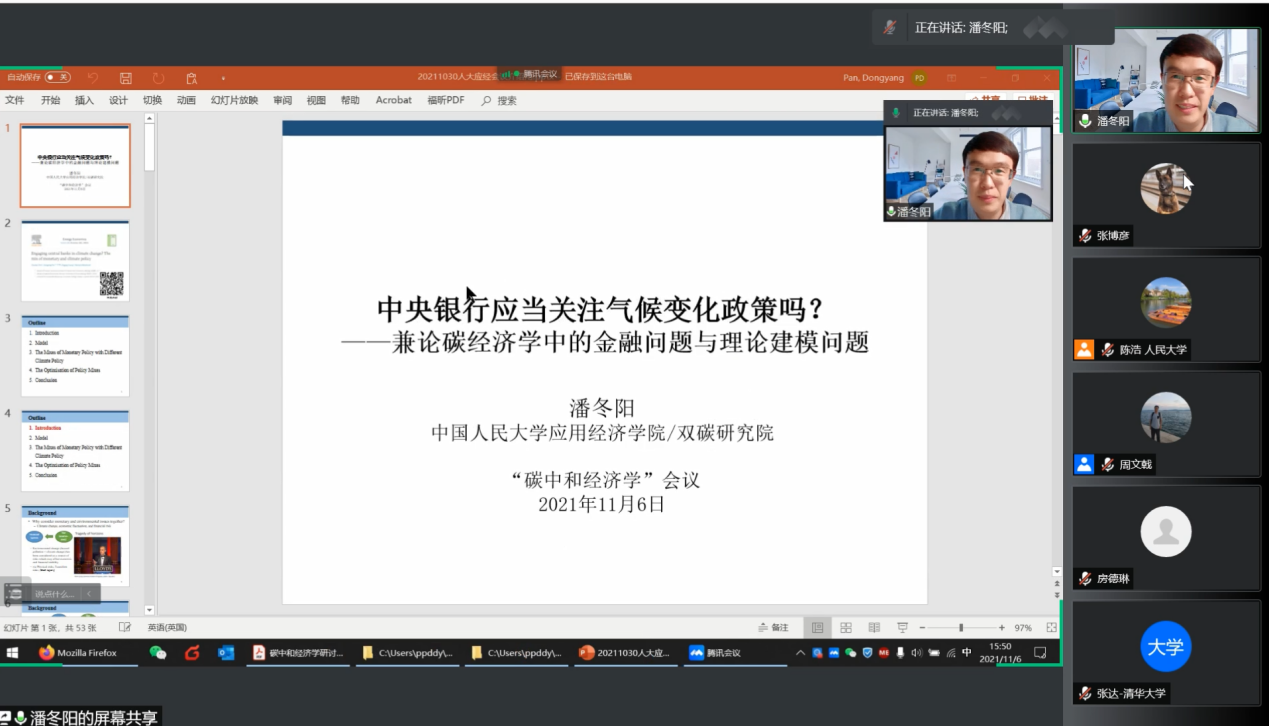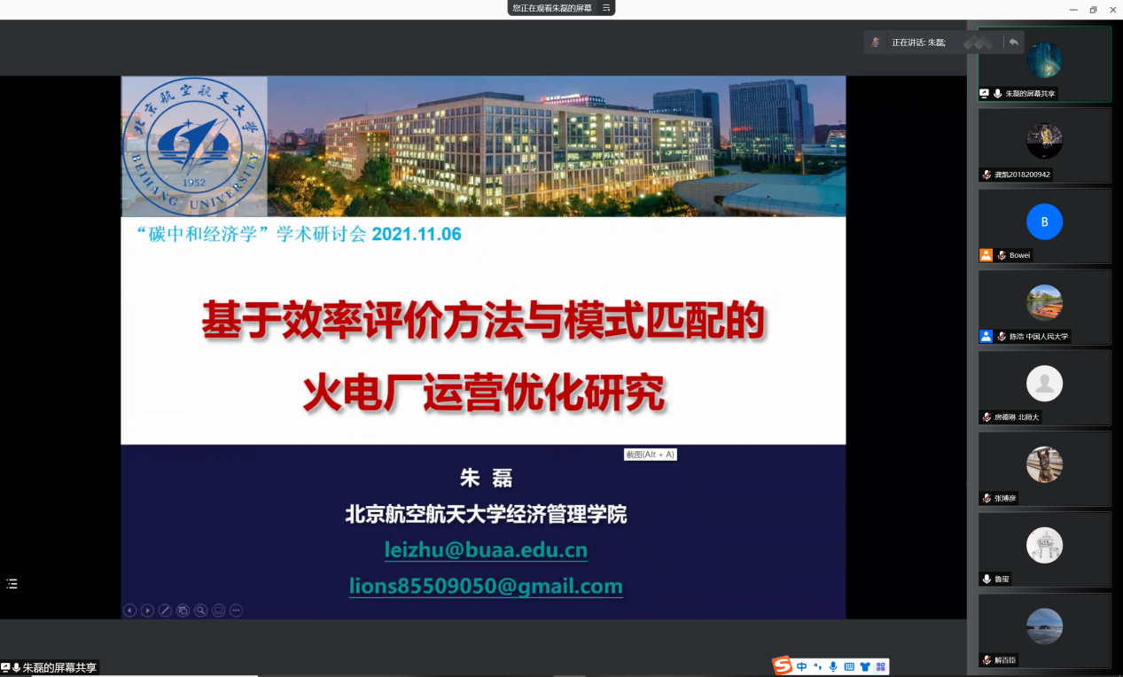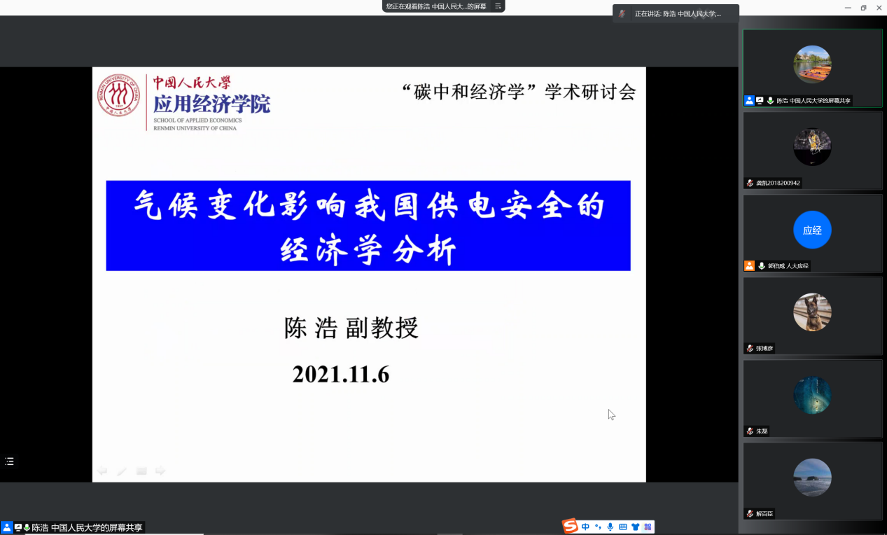 我国力争2030年前实现碳达峰、2060年前实现碳中和,这是党中央经过深思熟虑作出的重大战略决策。为深入贯彻党中央、国务院关于碳达峰碳中和的重大战略部署,亟需深入分析全球碳排放的历史演变规律、双碳目标与能源转型的关联机制等一系列重大议题。探花视频 和中国人民大学“碳中和”跨学科交叉平台于11月6日联合召开学术研讨会,本期主题为“碳中和经济学”,来自政府部门、高校和业界的二十余位专家学者参加会议。根据疫情防控要求,本次会议采用线上形式。