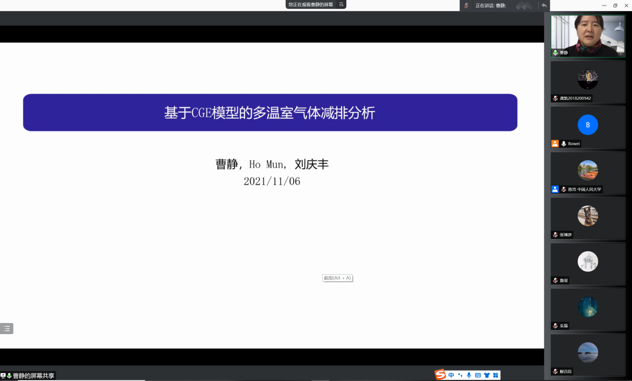 清华大学经济管理学院副教授曹静以《基于CGE模型的多温室气体减排分析》为主题进行展示。她阐述了非二氧化碳温室气体带来的经济社会影响以及非CO2的综合经济模型和协同治理,分析了不同基准情景和政策情景的经济增长与排放情况。