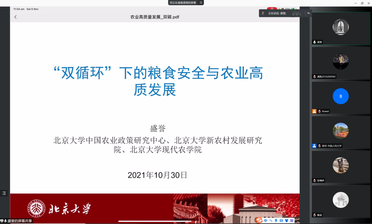 北京大学现代农学院副教授盛誉以《双循环下的粮食安全与农业高质发展》为主题进行展示。他从我国农业发展历史和现状、“双循环”下农业发展特征、中长期农业发展对策三个方面分析了双循环下如何保障粮食安全以及如何推进农业高质量发展。