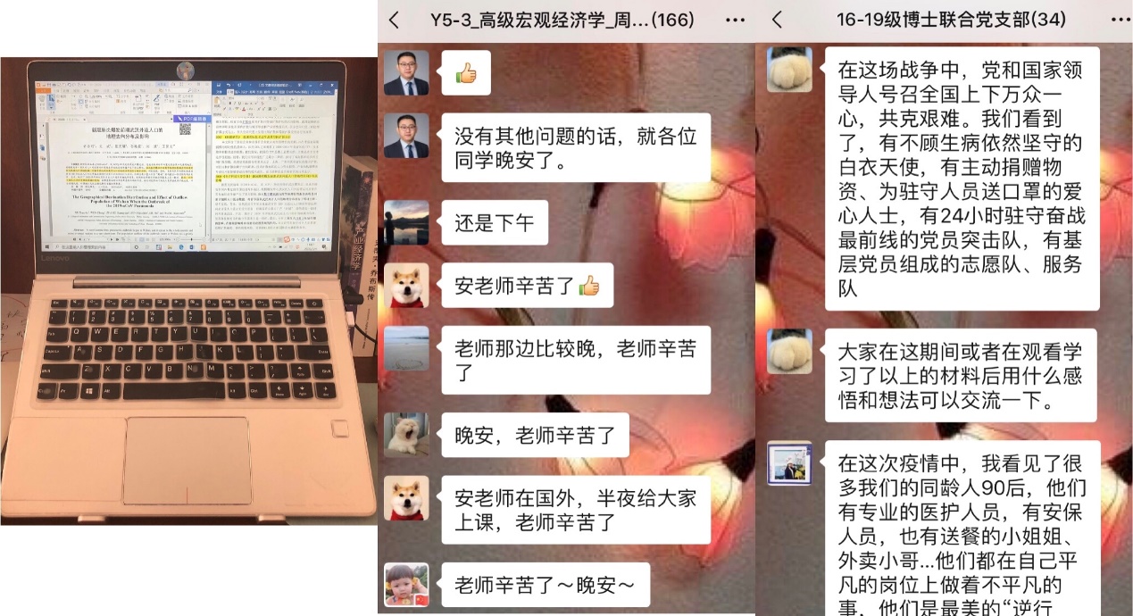 ——“安心”。疫情爆发以来,学院领导和老师们时刻牵挂着我们的身心健康和课程研习,从学院到导师组,从班集体到课程群,以及例行的党课教育活动都在时刻提醒我们特殊时期不忘“停课不停教、停课不停学、研学家中做”的重要理念,打消了我们无人指导,荒废时间的顾虑,为迎接正式开学后的学习打下良好基础。班级群内每日例行报告身体状况、导师的时刻关心和提醒、任课老师及助教的辛苦付出、党支部成员的团结一致都一一令我感动。虽然我们所有同学遍布在中国的大江南北,但是整个学院的努力让我有了一种强大的纪律感和组织感,帮助我在家中尽量做到自律,提高学习效率。