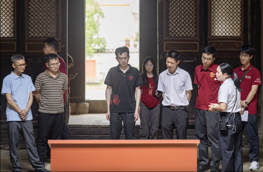 ▲调研团在小布镇中国工农红军第一部无线电侦察台旧址前合影