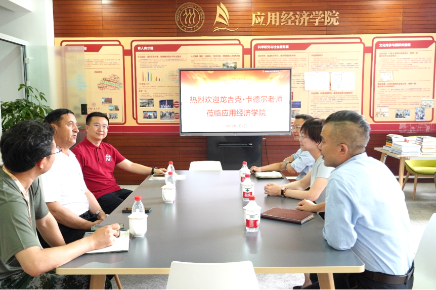 分享会前,党委学生工作部杨子强、学院院长郑新业、党委书记宋东霞会见龙吉克·卡德尔老师。