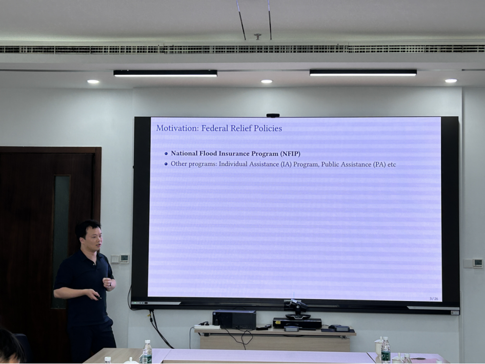 孙频作题为“Climate Change and Flooding Risk:The Spatial Implication of Flood Relief Policies”的报告,指出气候变化增加了洪水的频发性和严重性,提出了一种考虑洪水风险和人口流动的定量空间一般均衡模型,并分析了不同政策设计对福利水平的影响。