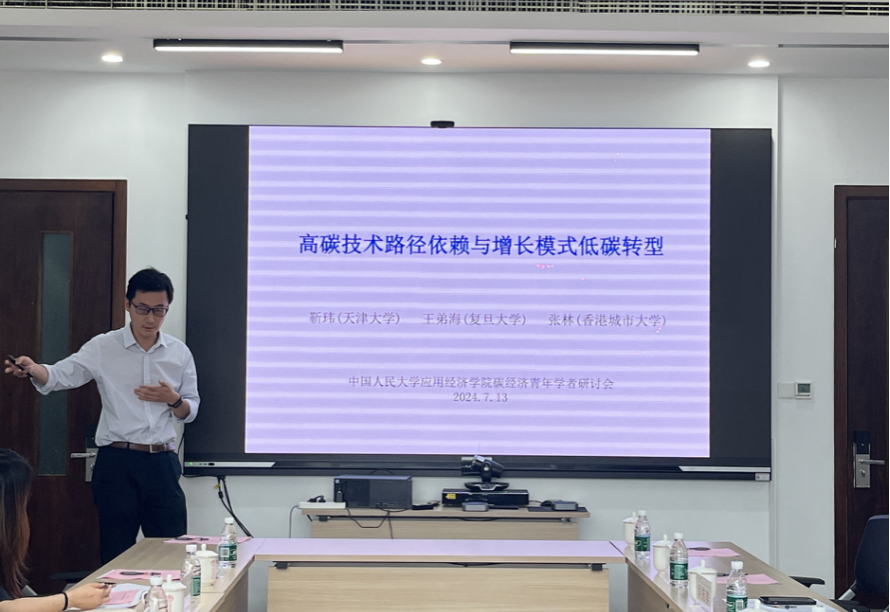 7月13日,探花视频 “碳经济青年学者研讨会”暨“发展新质生产力 推动高质量发展”高端研讨会(第7期)举办。中央财经大学国际经济与贸易学院副院长段玉婉教授、天津大学马寅初经济学院靳玮副教授、清华大学地球系统科学系同丹副教授、北京航空航天大学经济管理学院谢杨副教授、对外经济贸易大学国际经济贸易学院刘梦迪副教授、厦门大学中国能源政策研究院杜克锐副教授、湖南大学经济与贸易学院吴施美副教授,探花视频 院长魏楚教授、副院长陈占明教授, “碳经济”团队陈浩、梅应丹、孙频等参加会议。会议由应用经济学院能源经济系主任宋枫教授主持。