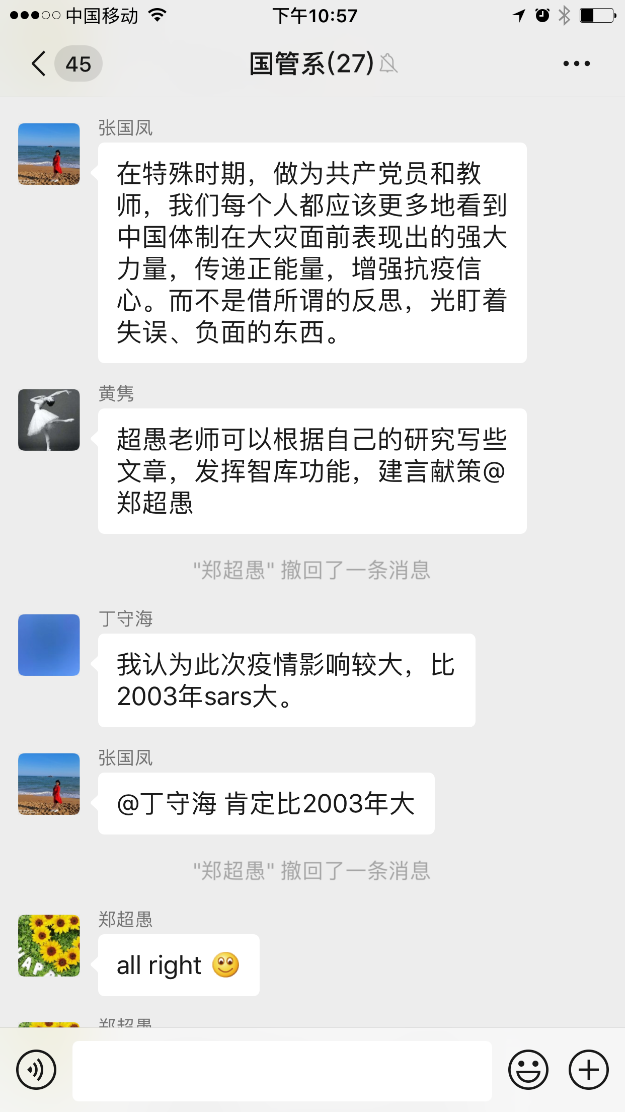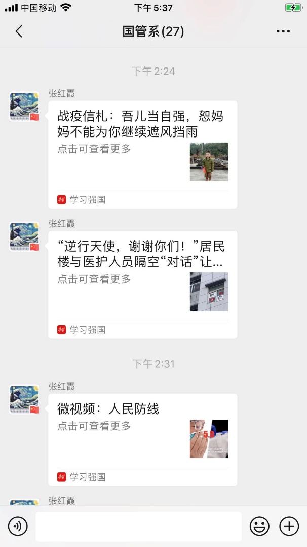 2月25日,在全国抗击新冠肺炎的关键时刻,探花视频 行政人员党支部响应学院党委号召,打破空间限制,在微信群中开展“应经抗疫,行政党员在行动”线上主题党日活动,全体党员参与本次活动。每位党员都结合自己的工作和生活谈了自己的认识与感触,共同交流共同学习,保障学院各项工作顺利开展,共同努力成为应经抗疫中的先锋。大家纷纷发言,众志成城,希望用实际行动为学院、为学校、为国家的防疫工作做出应有的贡献!