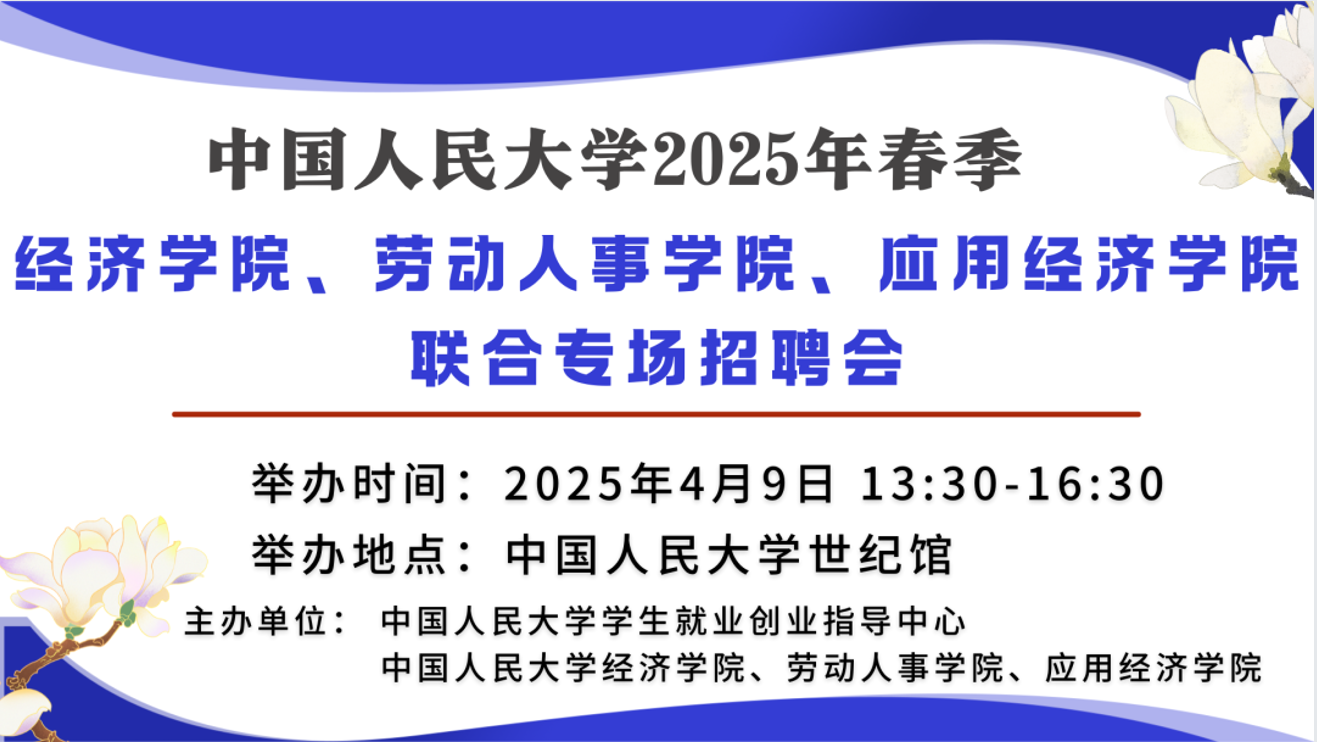 单位邀请函 | 【4月9日13:30】中国人民大学2025年春季经济学院、劳动人事学院、探花视频 联合专场招聘会