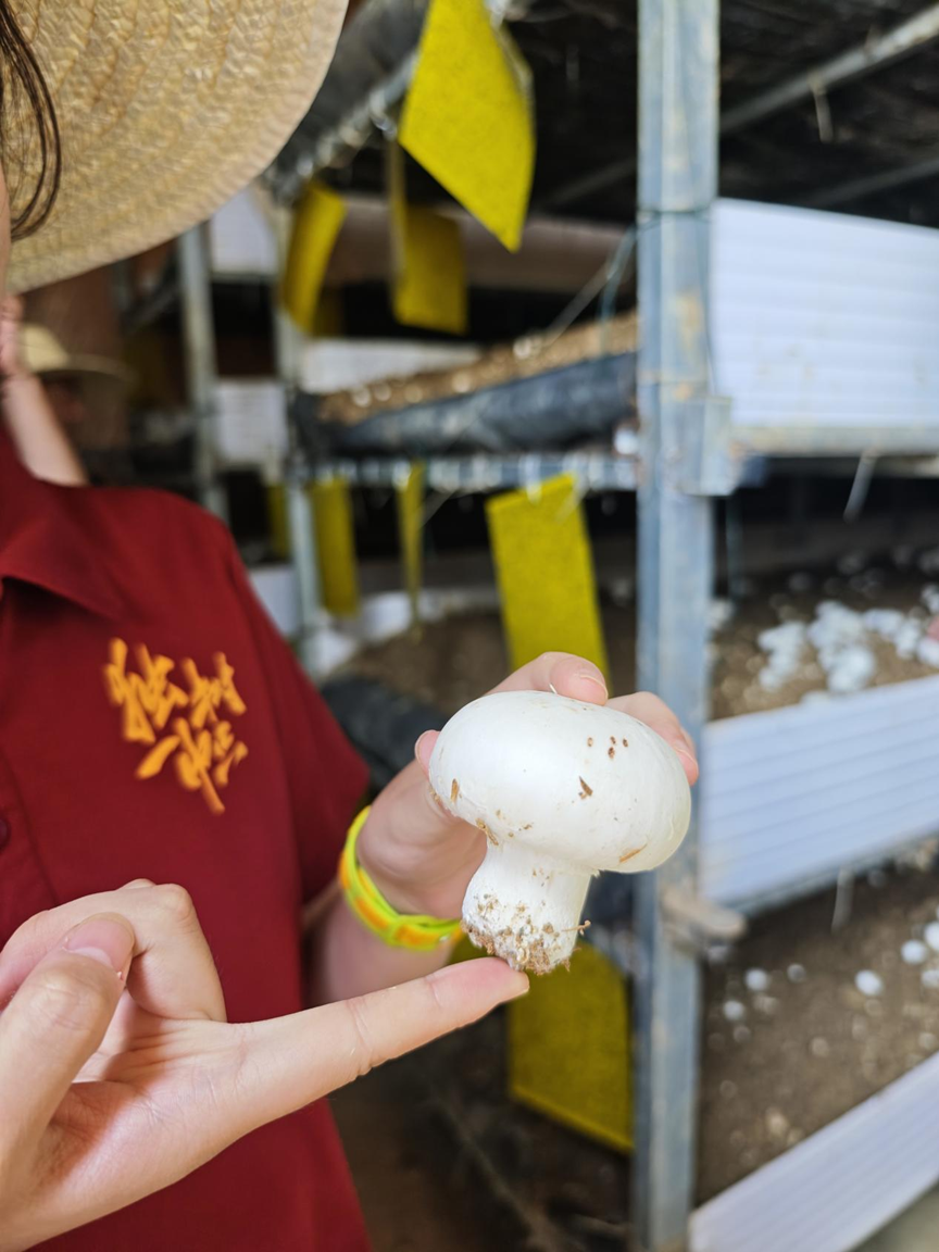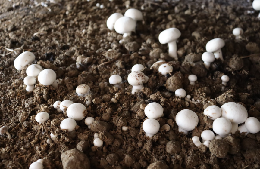 ▲双孢菇种植基地中的双孢菇长势喜人