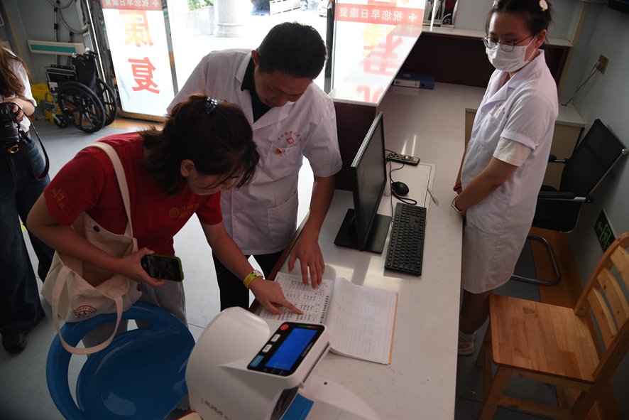 ▲ 牛田镇中心医院工作人员在为调研团成员介绍医疗扶贫登记情况