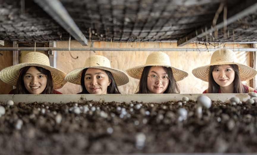 ▲新闻学院调研团在双孢菇种植基地