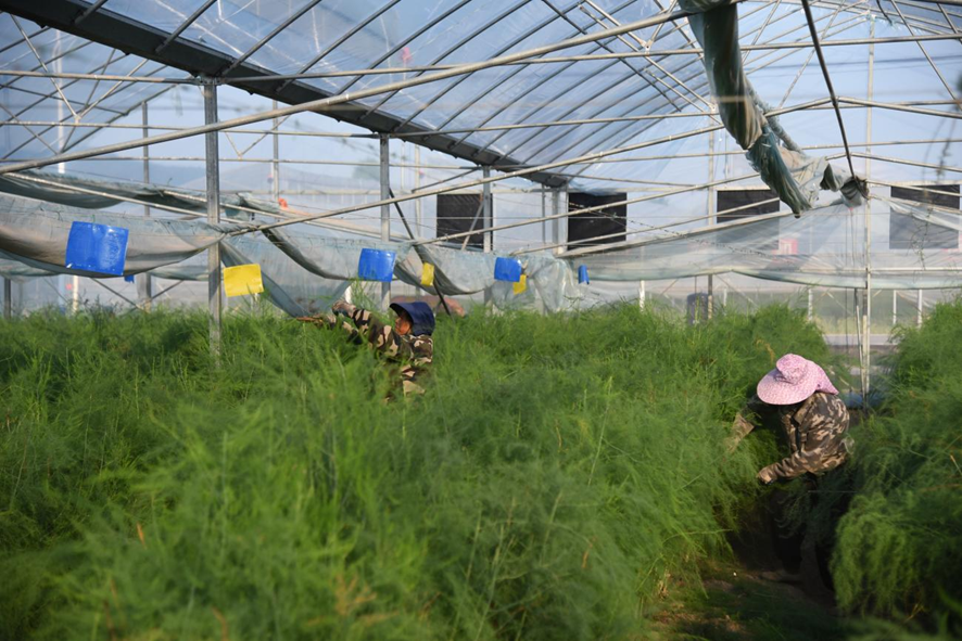 ▲芦笋种植基地的工人在劳作