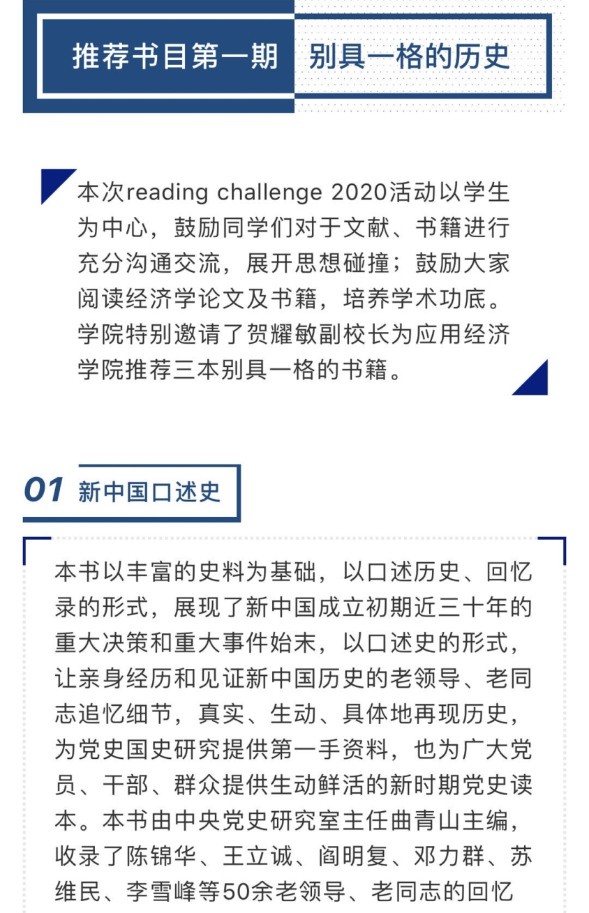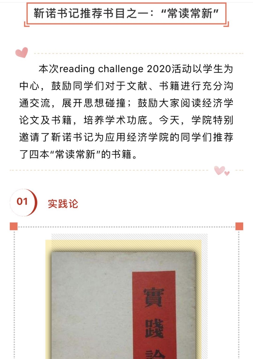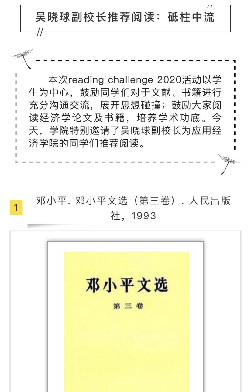 为进一步落实“三全育人”体制机制,做好疫情期间的人才培养工作,培养适应新时代要求的应用经济学“三有”人才,鼓励同学们在疫情期间阅读经典文献、追踪前沿研究,学院党委积极与多位学校领导请示,邀请靳诺书记、刘伟校长、贺耀敏副校长、吴晓球副校长和学院教师一起,为探花视频 的同学们推荐“主流、经典、前沿”书籍,鼓励同学们在阅读中增长知识,在阅读中扩大视野。