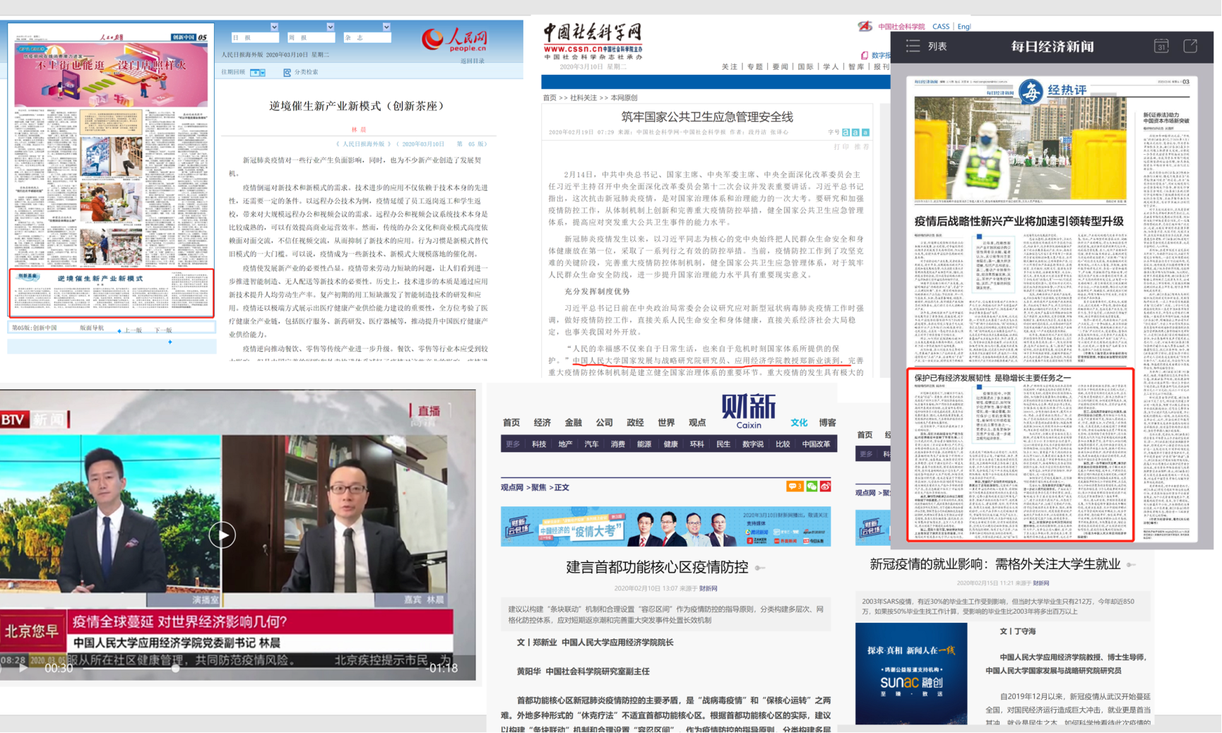 郑新业、丁守海、姚永玲、林晨等多位老师通过公开发表疫情探花视频相关的文章、接受媒体访谈等形式,对民众十分关切的疫情对经济发展、就业影响等话题予以解答,人民日报(海外版)、人民网专刊、中国社科报、每日经济新闻、财新网和北京电视等媒体对相关观点进行了专门报道。