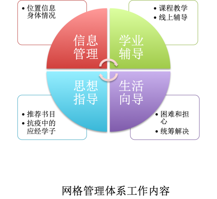 创立经纬交汇、信息直报的横纵双向多维度网格管理体系,确保一线数据信息实现师生双覆盖。依托班级的横向沟通联络机制和各类导师为主体的纵向沟通联络机制,学院每日核实每位学生情况,一一访查;同时,学院建立湖北同学单独微信群、国际学生单独微信群等微信群,实现信息直报。横、纵全口径网格化管理,确保实现班主任、辅导员和每一位导师双监督,压实了责任压实了工作;实现了全部学生数据信息横纵两个渠道的交互印证、双向校准,凸显网格管理模式的科学化,实现与学工体系交互数据100%吻合。
