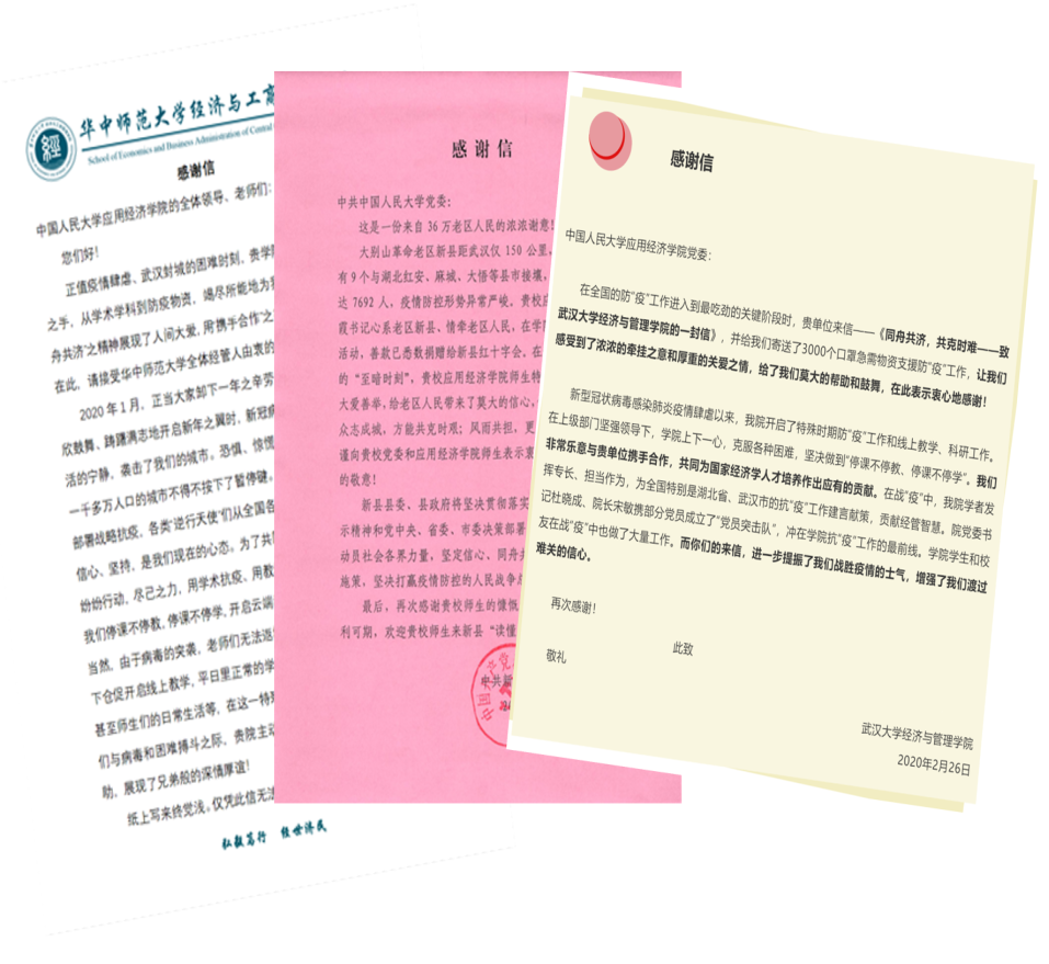 在疫情防控期间,学院党委发挥领导核心作用,院领导、院党委委员积极带头,做好表率。考虑到湖北疫情防控的严峻性,学院副院长张可云教授多方筹措口罩等物资资源,学院党委尽最大努力给武汉大学经济与工商管理学院、长江大学经济与管理学院、华中师范大学经济与工商管理学院致慰问信,援寄口罩,表达对兄弟学院的牵挂与支持。院长、党委副书记郑新业教授,多方呼吁筹措,积极协调部分医用防护物资和经费,支持援助受疫情影响较大的老区—河南新县的防疫工作,新县疫情防控指挥部专门致信表达感谢;学院可持续发展课题组发起疫情防控帮扶老区倡议,课题组师生、学院党委会委员、党政联席会成员等部分师生自愿出资35200元,为河南新县抗击疫情传送一份力量和信心;与此同时,依托线上调研平台,学院师生与新县疫情防控指挥部共同开展了“新县务工人员情况调查”,力图通过数据分析,为新县积极开展相关工作提供参考。