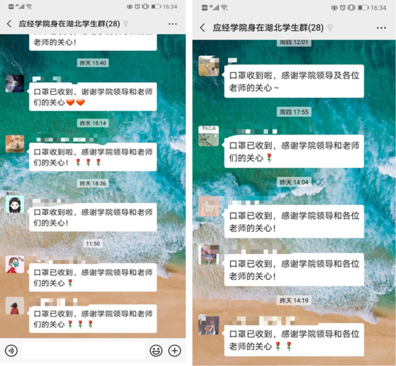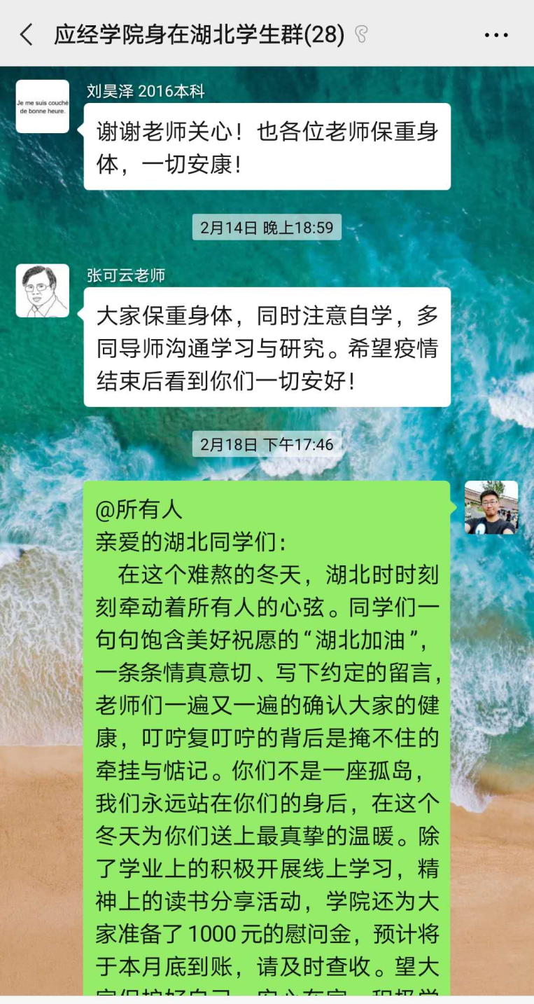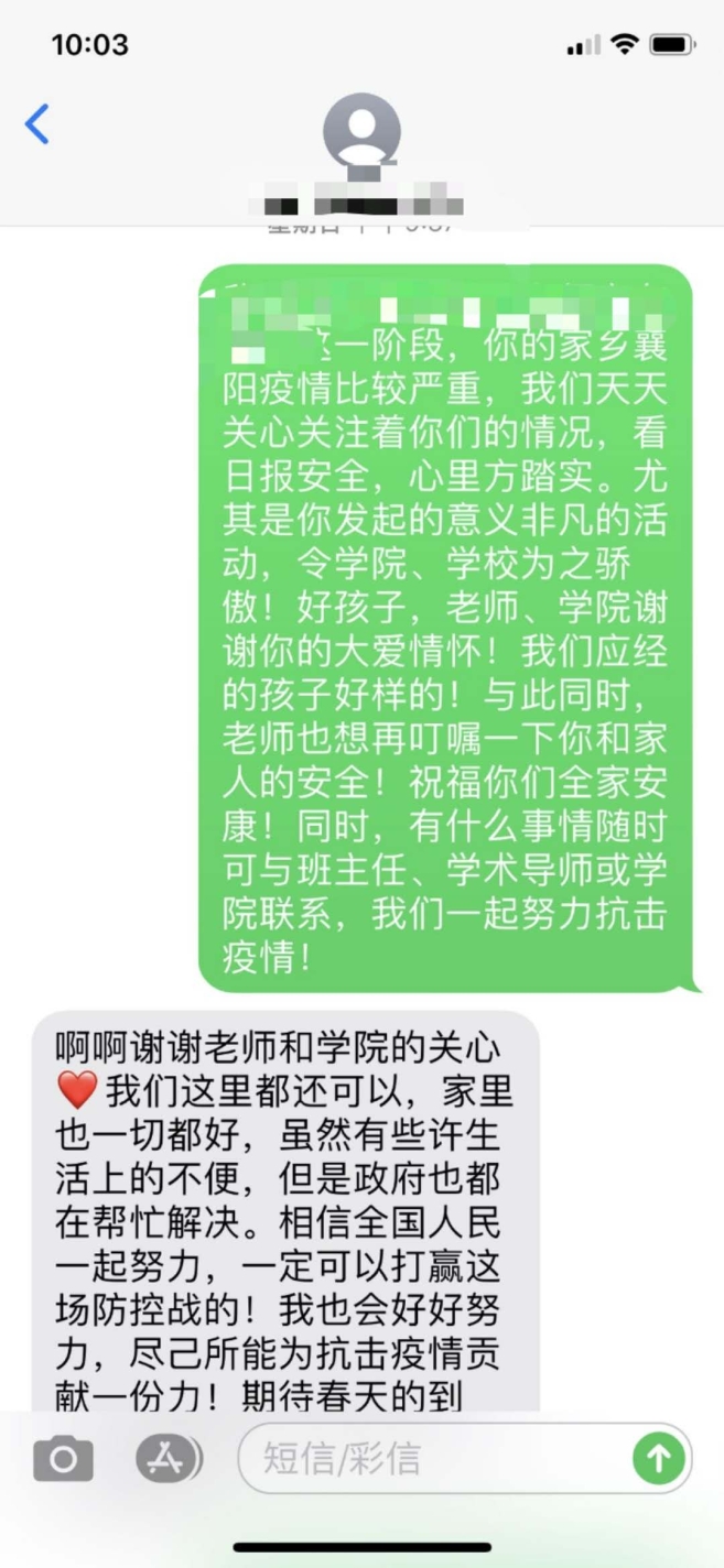 特别是对21位身在湖北的学生,学院专门建立微信群,随时沟通、解决问题;身在湖北同学在小程序中每日报告身体情况、位置情况;学院为湖北籍同学每人发放1000元慰问金;学工系统和辅导员老师询问湖北同学生活、学习遇到的困难、问题,统筹帮助解决;学院向每一位身在湖北的同学邮寄了口罩,助力他们和家人做好防护,渡过难关。学院院长郑新业亲自与全家投入抗疫工作的学生及其家长联系,邀请家长参加毕业典礼,学生家长表示“心里感到特别温暖”。学院党委书记宋东霞亲自与21名湖北学生一一联系,了解同学们及家人的身体情况,表达全院教师对同学们的关心,同学们纷纷表示“感谢学院及老师们的关心”“一定会严格按照政府和学校的要求安排自己的学习生活”“疫情不可怕,我们一定能够战胜它”。