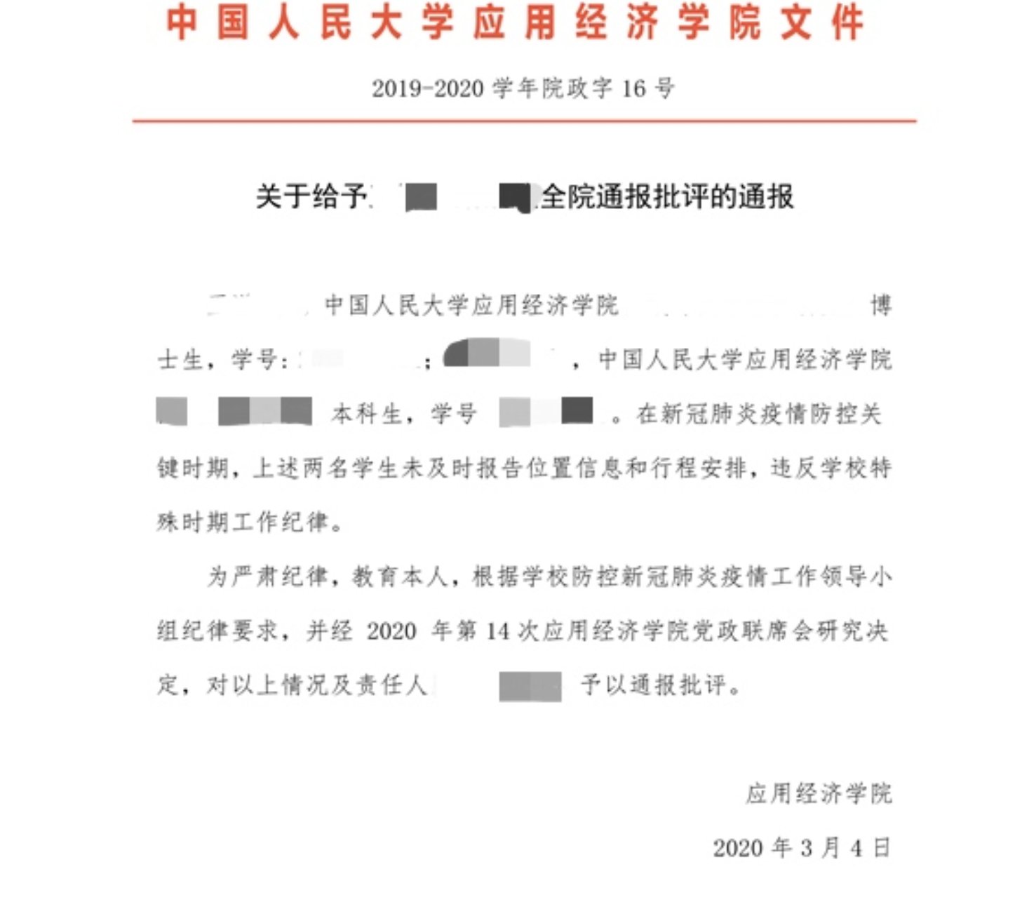 学校各项政策规定,学院均通过横纵网络机制,确保将信息完整准确传达至每位同学;学院对部分班级台账信息的完整和精准性、对部分老师和同学沟通情况进行了抽查;对学院三令五申强调纪律后仍不完全遵守的同学,学院果断给予严肃处理,对违规同学给予全院通报批评,对全院学生进行警示教育。