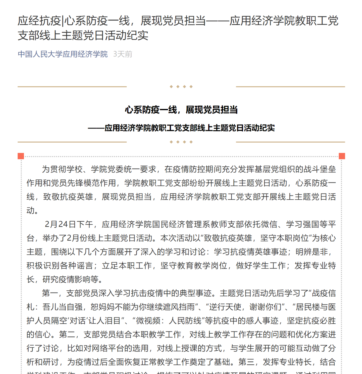 学院党委还鼓励教师、学生党支部创新形式,积极开展专题主题党日活动。国民经济管理教师党支部、区域所教师党支部、能源经济教师党支部、行政人员党支部、国民经济管理博士党支部、2018级国民经济管理硕士党支部等师生党支部纷纷开展了线上专题主题党日,各位党员积极参与,结合自身的工作、学习、生活、志愿者体验等,畅谈认识和体会。在防控疫情中,党建引领在前,党员先锋在前,优秀学生在前,所有教职员工和广大师生用自己的实际行动积极投入到疫情防控的战斗之中。