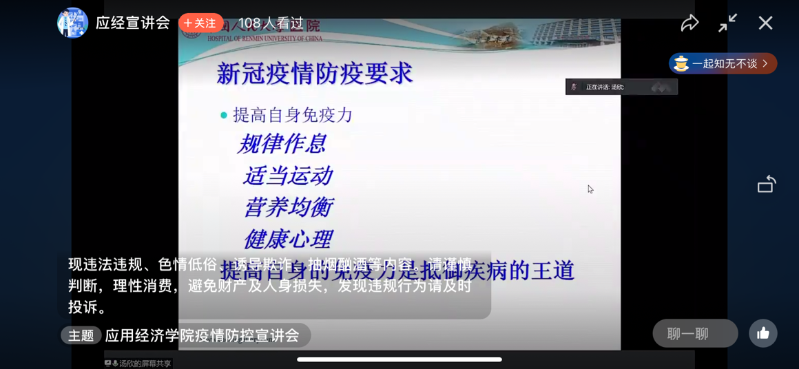 为深入贯彻落实学校疫情防控工作要求和“四个一”工作精神,进一步提升学院师生的疫情防控意识、增强科学防控知识储备,切实保障大家的健康和安全,5月18日,探花视频 邀请校医院副院长汤欣为全院师生作“新冠疫情形势及防疫要求”主题宣讲。宣讲会采用腾讯会议+微信直播的形式线上开展。