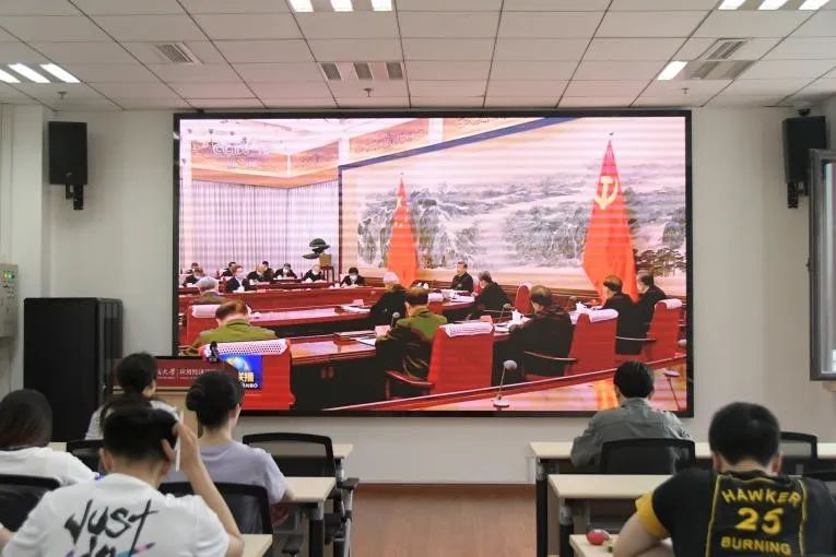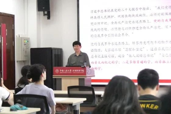 学院党委副书记裴建锁围绕“以构建新发展格局推动高质量发展”主题,结合党的二十大报告,通过丰富的数据和案例,讲解了“以国内大循环为主体、国内国际双循环相互促进的新发展格局”等内容,帮助同学们更加深刻地理解了“加快构建新发展格局,着力推动高质量发展”的丰富内涵。