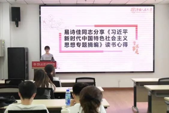 宣讲结束后,团支部组织开展主题教育读书分享,党员付善吉、易诗佳分享学习《习近平新时代中国特色社会主义思想专题摘编》的心得感想。同学们在倾听他人的心得体会中感受思想共鸣,在共同讨论交流中产生思想碰撞。