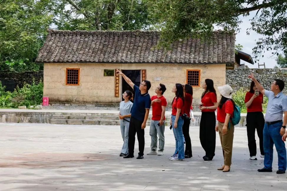 ▲调研团在高荡千年布依古寨前合影