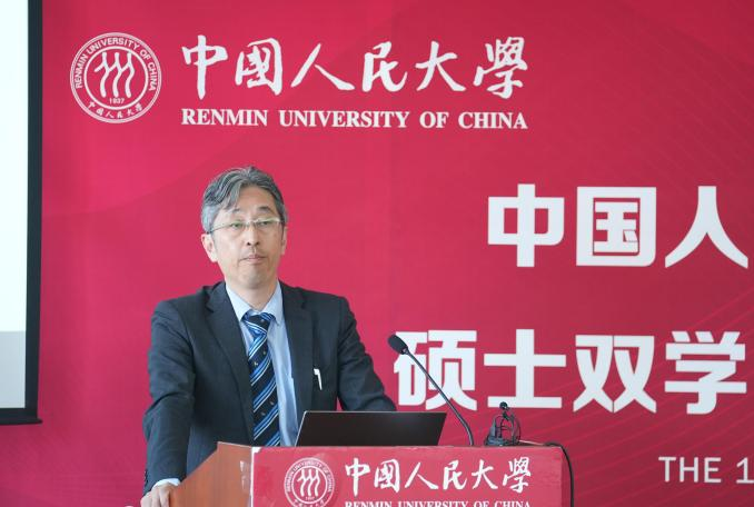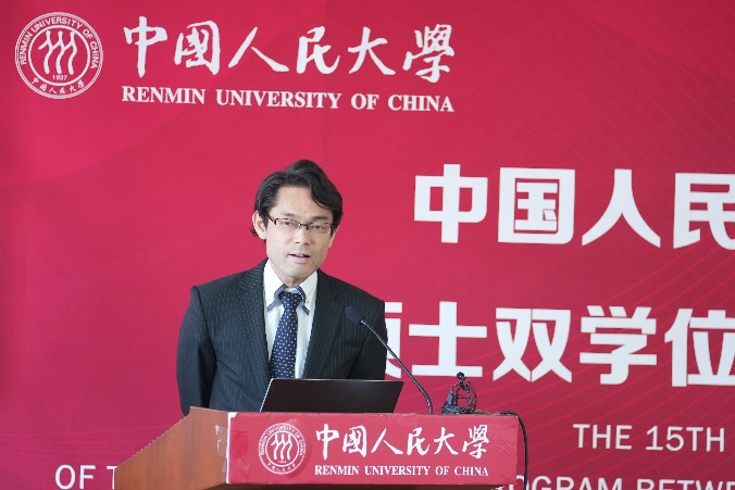 九州大学副校长岩田健治首先对中国人民大学承办此次庆典活动表示由衷感谢。他介绍了九州大学目前在教学和研究条件上的发展现状和未来方向,并且回顾了两校多年来在学术交流和教育合作项目方面的友好合作和深厚友谊,同时对于接下来两校在硕士双学位项目的持续合作致以美好的祝愿和决心。