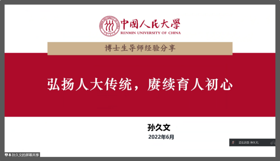 孙久文借用毛泽东给陕北公学的一段题词“要造就一大批人,这些人是革命的先锋队”阐明对“为党育人,为国育才”的理解。孙久文从五个方面向大家分享如何践行人大的光荣传统和初心使命。首先,他带领大家学习了中国人民大学的建校历程以及自己在中国人民大学的求学岁月;随后,他从三个角度分享了与学生交朋友的方法以及从重视教学方法以及如何指导学生论文两个方面分享了自身的心得体会;最后,他剖析了承担科研课题与培养学生的辩证统一关系。