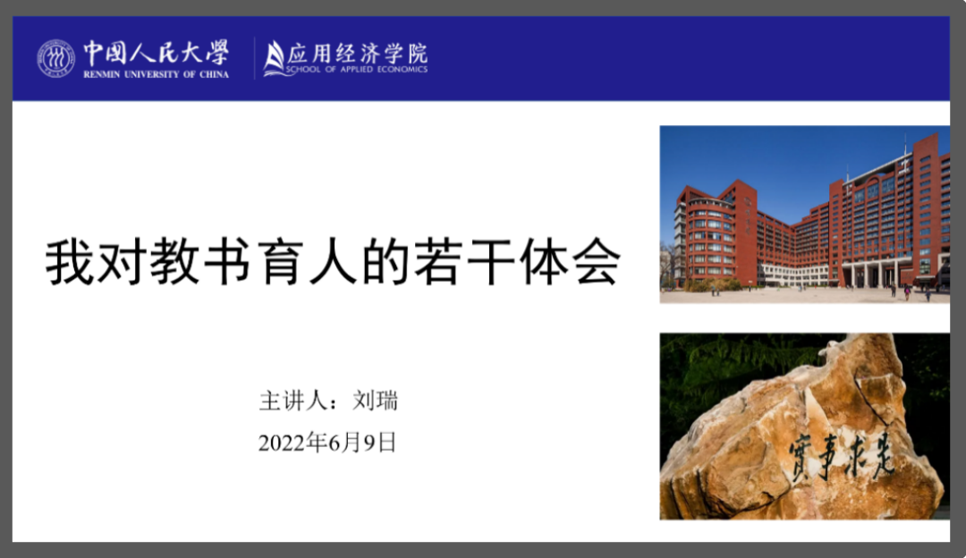 刘瑞漫谈了自己40年来从教生涯的切身体会。首先,刘瑞重点回顾了2022年4月25日习近平总书记在中国人民大学考察时的重要讲话精神,刘瑞认为高校教师要认真学习贯彻习总书记讲话精神,不仅要作“经师”更要作“人师”;其次,刘瑞谈到了现代高校教师在教书育人过程中所承担的角色,同时也简要地回顾了自己留校从教的成长经历;最后,刘瑞从研究生导师“如何选学生”“如何教学生”“如何与学生相处” 三个方面进行了分享交流。在“选学生”方面,刘瑞认为研究生导师应遵循有教无类的原则,秉持为社会培养人才的理念;在“如何教学生”方面,刘瑞认为教的方式必须依照学生个人的追求、能力和素养等特点而定,因材施教;在“如何与学生相处”方面,刘瑞坚信好的师生关系应是包含平等和尊重的良师益友型关系。