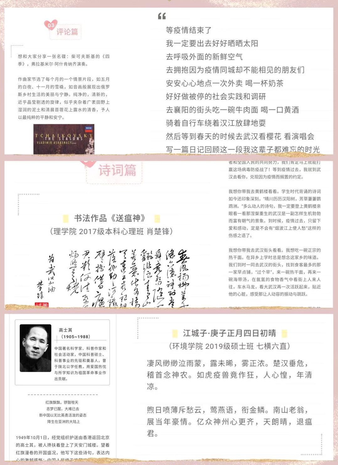 几天前,我们20多位参与众志成城方阵的湖北籍同学共同发起了征集活动,面向全校征集“为湖北加油、向逆行者致敬”的网络作品。活动一经推出,就得到了学校师生的广泛响应,大家踊跃来稿,各种原创诗歌、书法作品、手写祝福、鼓励视频、亲笔书信,每一个投稿都饱含着大家对抗疫情的信心和决心,传递着对身处抗疫最前线的湖北同胞的关心和鼓励,都表达着对奋斗在一线的最美逆行者——白衣天使们最崇高的敬意。征集作品,整理稿件,采访一线医护人员,寻找素材,编辑推送,大家各司其职,共同协作,互相鼓励,我们努力记录来自抗”疫“第一线的同胞们的心声,铭记一个个坚守的故事……
