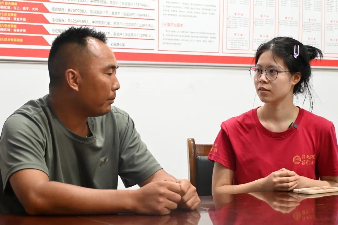 ▲调研团新闻学院本科生符文迪访谈滑石乡老麻塘村脱贫户龙启发