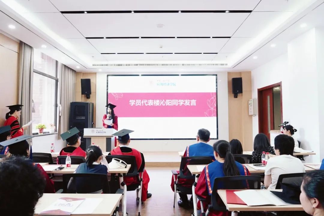 学员代表楼沁阳发言。楼沁阳表示,非常珍惜在人大的学习机会,与母校相识十二年,是中国人民大学严谨务实的学风,来自学院领导和老师的悉心关怀,家人的理解与支持、同学间的帮助与扶持,还有自己对学业的不断追求和不懈付出将自己送至今天这一高光时刻,今天取得的成就是多方努力的结果。愿在今后的工作学习中,向前行进的脚步不停,传承人大红色基因,始终与祖国同向,与人民同心,与母校同行。