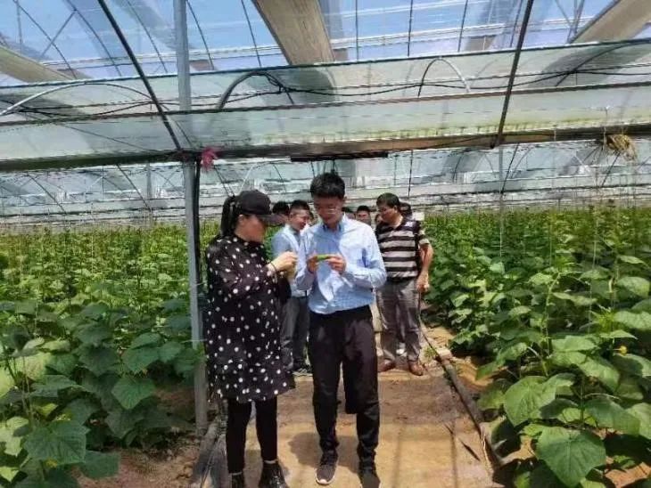 ▲调研团调研庄里镇高庄村智慧农业示范园中的黄瓜园区